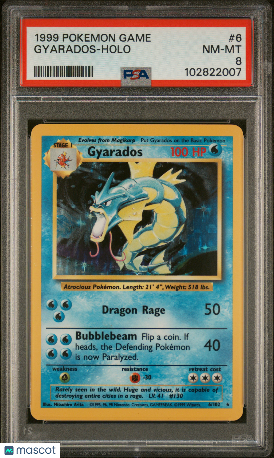 You are purchasing a 1999 Pokemon Game Gyarados #6 Holo PSA 8. You will receive the exact item in the photographs. Thank you for looking. Listed With Mascot.