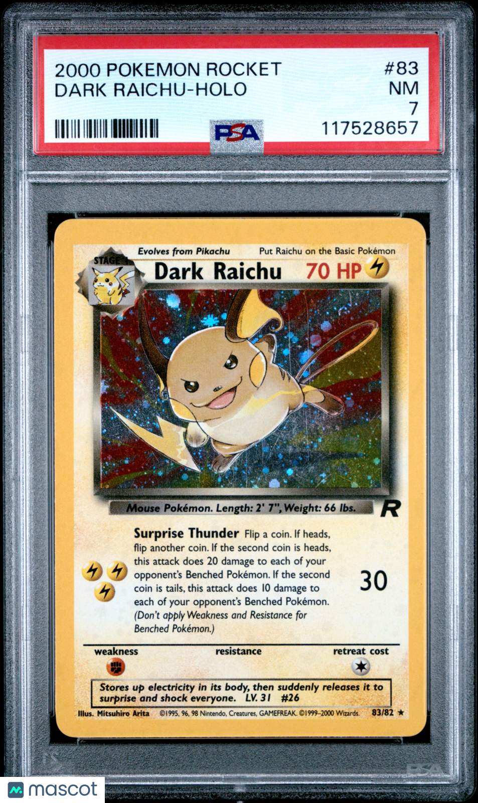 You are purchasing a 2000 Pokemon Rocket Dark Raichu #83 Holo PSA 7. You will receive the exact item in the photographs. Thank you for looking. Listed With Mascot.