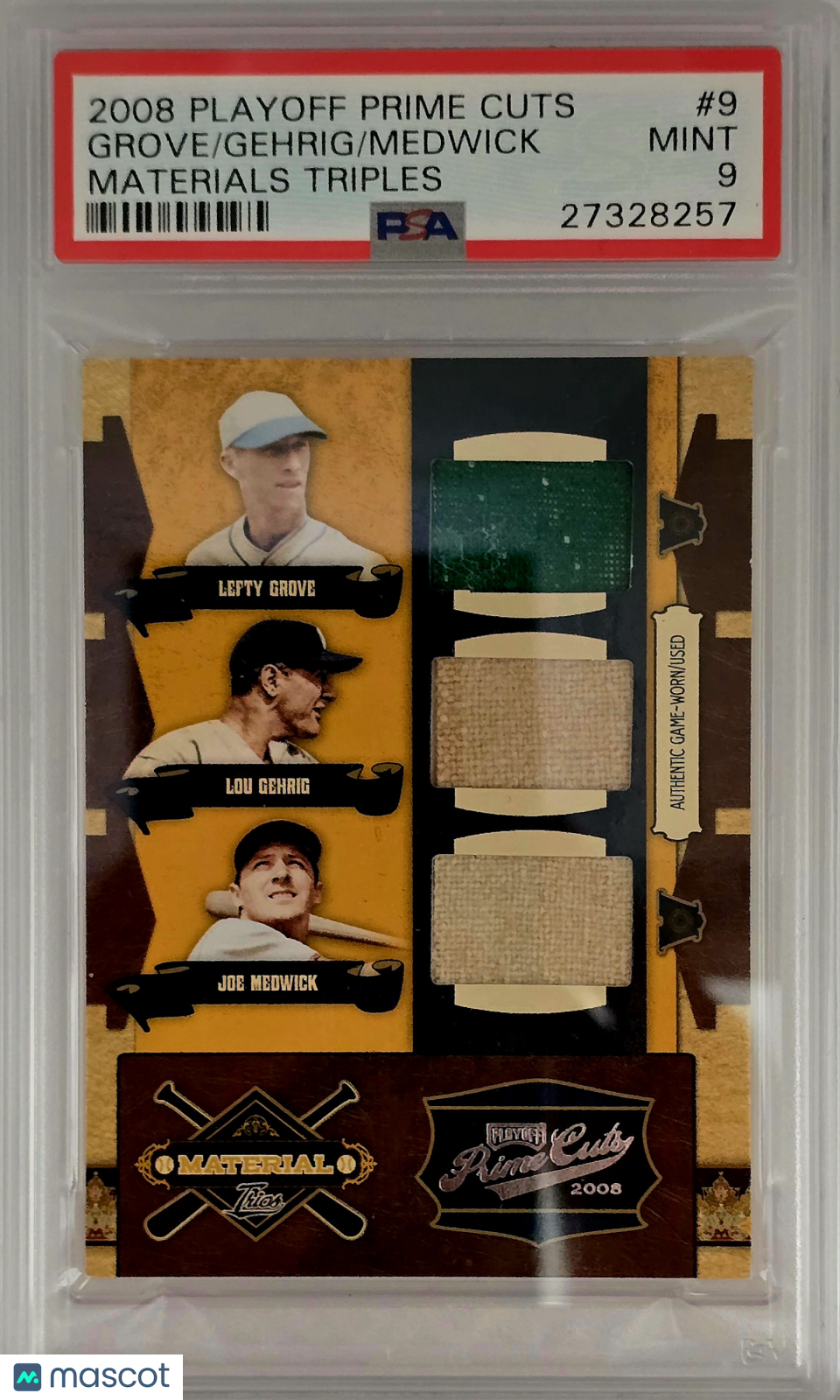 You are purchasing a 2008 Playoff Prime Cuts Materials Triples Medwick Gehrig Grove #9 Triple Game Used Relic 20/25 Parallel/Variety Highest Pop Relics Combo Low Pop Mint Triple Combo Game Used Jersey PSA 9. You will receive the exact item in the photographs. Thank you for looking. Listed With Mascot.