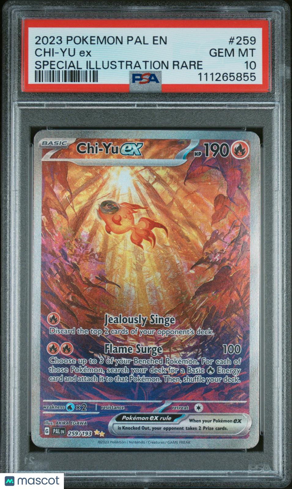 You are purchasing a 2023 Pokemon Pal EN-Paldea Evolved Chi-Yu EX #259 Full Art Gem Mint Special Illustration Rare PSA 10. You will receive the exact item in the photographs. Thank you for looking. Listed With Mascot.