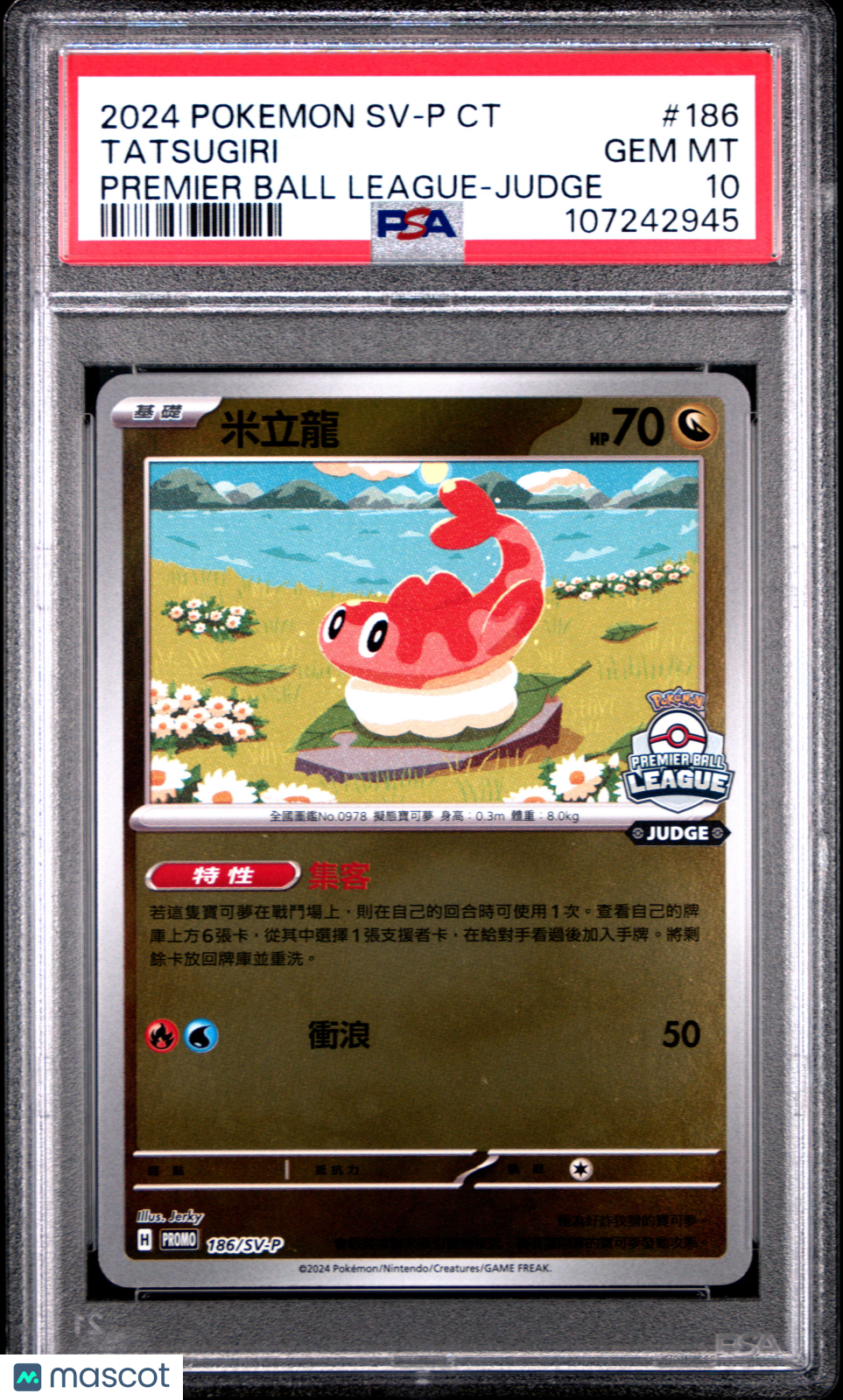 You are purchasing a 2024 Pokemon Traditional Chinese SV-P Promo Tatsugiri #186 Chinese Foil Judge Exclusive Low Pop Gem Mint Promo Premier Ball League-Judge PSA 10. You will receive the exact item in the photographs. Thank you for looking. Listed With Mascot.